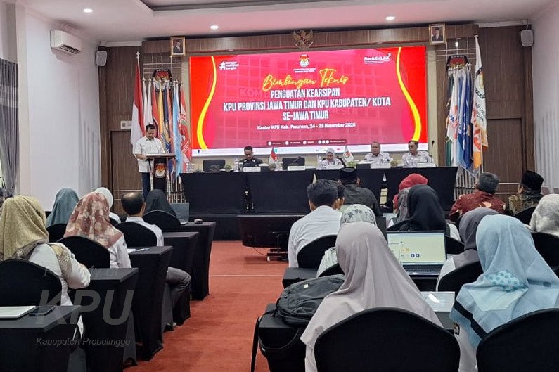 Kab-probolinggo.kpu.go.id, KPU Kabupaten Probolinggo bersama 37 KPU Kabupaten/Kota mengikuti kegiatan Bimtek Penguatan Kearsipan di Lingkungan KPU Provinsi dan KPU Kabupaten/Kota se-Jawa Timur. Kegiatan tersebut untuk mendukung implementasi Sistem Pemerintahan Berbasis Elektronik (SPBE) serta meningkatkan kemampuan pengelolaan kearsipan di wilayah Jawa Timur. Kegiatan Bimtek diadakan selama dua hari dari Hari Senin – Selasa, 24 – 25 November 2025, bertempat di Aula Kantor KPU Kabupaten Pasuruan yang diselenggarakan oleh KPU Provinsi Jawa Timur. Sekretaris KPU Provinsi Jawa Timur, Nanik Karsini menegaskan pada para Kasubbag KUL dan Operator agar konsisten mengimplementasikan Sistem Pemerintahan Berbasis Elektronik (SPBE) melalui penggunaan aplikasi Srikandi. Tidak hanya itu Nanik juga meminta peserta menyimak dengan sungguh-sungguh materi yang akan disampaikan oleh Narasumber dari Dinas Perpustakaan dan Kearsipan Pemda Kabupaten Pasuruan, sehingga ilmunya dapat dipraktekkan di lingkungan kerja masing-masing, tambahya. ....
