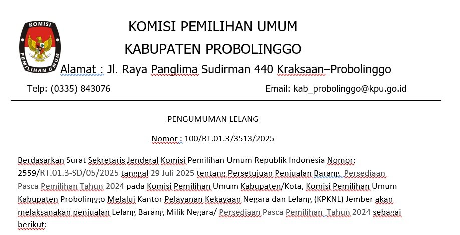 Berdasarkan Surat Sekretaris Jenderal Komisi Pemilihan Umum Republik Indonesia Nomor: 2559/RT.01.3-SD/05/2025 tanggal 29 Juli 2025 tentang Persetujuan Penjualan Barang Persediaan Pasca Pemilihan Tahun 2024 pada Komisi Pemilihan Umum Kabupaten/Kota, Komisi Pemilihan Umum Kabupaten Probolinggo Melalui Kantor Pelayanan Kekayaan Negara dan Lelang (KPKNL) Jember akan melaksanakan penjualan Lelang Barang Milik Negara/ Persediaan Pasca Pemilihan Tahun 2024. Selengkapnya dapat diunduh DISINI
