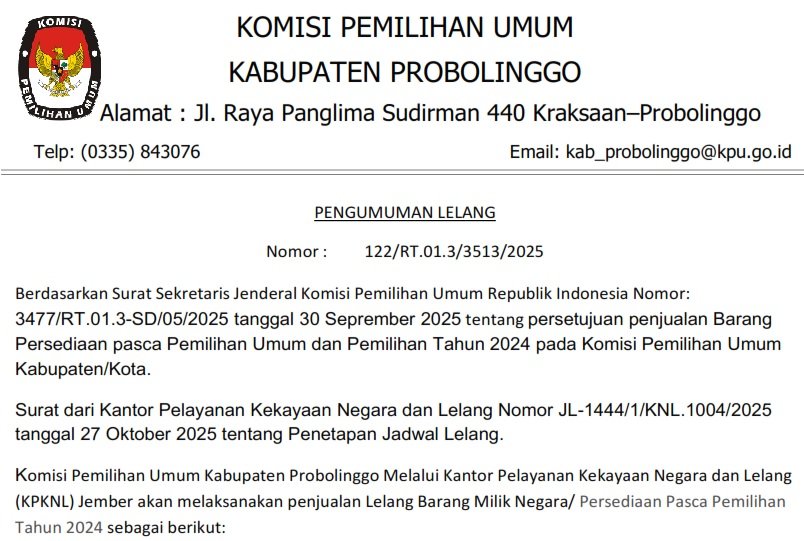 Kab-probolinggo.kpu.go.id, Berdasarkan Surat Sekretaris Jenderal Komisi Pemilihan Umum Republik Indonesia Nomor: 3477/RT.01.3-SD/05/2025 tanggal 30 Seprember 2025 tentang persetujuan penjualan Barang Persediaan pasca Pemilihan Umum dan Pemilihan Tahun 2024 pada Komisi Pemilihan Umum Kabupaten/Kota.