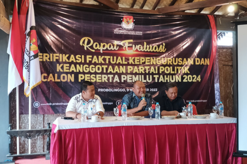Kab-probolinggo.kpu.go.id, Kamis 10 November 2022, Komisi Pemilihan Umum Provinsi Jawa Timur (KPU Jatim) bersama dengan KPU Kabupaten/Kota melakukan evaluasi terkait tahapan verifikasi faktual di kantor KPU Kota Pasuruan. Rapat Evaluasi Verifikasi Faktual Kepengurusan dan Keanggotaan Partai Politik Tingkat Kabupaten/Kota dan Provinsi Jawa Timur dilaksanakan selama 3 hari mulai tanggal 10 -12 Nopember 2022. Acara dibuka oleh Ketua KPU Jawa Timur Choirul Anam. Dalam sambutannya Anam menyampaikan tentang proses verifikasi faktual yang dilalui dengan banyak dinamka. " Dinamika dalam tahapan pemilu harus dilalui dengan baik karena tahapan semakin luar biasa kegiatannya dan harus bisa dilalui dengan bekerja sebaik mungkin dan sebahagia mungkin" ungkapnya " Semua tahapan beriringan sehingga semua harus dapat mnjaga stamina dan tetap menjaga kondisi fisik dan psikis" tambah Anam dalam arahannya. Peserta Rapat Evaluasi terdiri dari Divisi Teknis Penyelenggaraan, Kasubag Tekmas, dan admin/verifikator Sistem Informasi Politik (Sipol) se Jawa Timur. KPU Kabupaten Probolinggo hadir dalam acara tersebut Agus Hariyanto Andinata Divisi Teknis Penyelenggaraan, Kasubag Tekmas Domenicus Widji Nugroho dan Dinny Pudjianah sebagai admin Sipol.