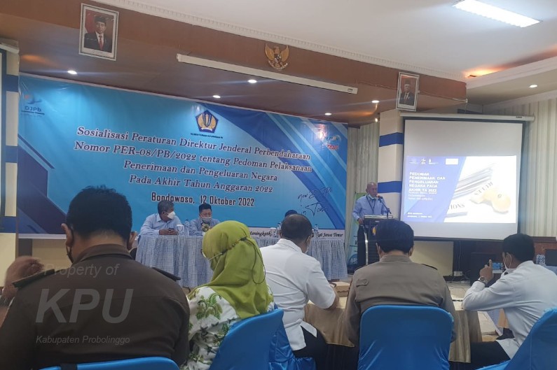 Kab-probolinggo.kpu.go.id, Dalam persiapan akhir tahun 2022 KPPN Bondowoso undang mitra kerja kegiatan Sosialisasi Peraturan Direktur Jenderal Perbendaharaan Nomor PER-08/PB/2022 tentang Pedoman Pelaksanaan Penerimaan dan Pengeluaran Negara Pada Akhir Tahun 2022 di Aula KPPN Bondowoso Rabu, 12 Oktober 2022. Dengan dihadiri oleh Kuasa Pengguna Anggaran (KPA) seluruh mitra kerja, kepala KPPN Bondowoso A. Budi Dayantoro mengingatkan bahwa KPA juga bertanggung jawab dengan cash flow di satker dan jangan membuat manajemen kebijakan yang membingungkan dan memberatkan PPK, PPSPM dan bendahara, serta kita tidak bosan mengingatkan bapak ibu KPA untuk hati-hati dengan kebijakan yang diambil. KPU Kabupaten Probolinggo sebagai mitra kerja KPPN Bondowoso di wakili oleh Adhityo Wibowo Kasubbag Keuangan Umum dan Logistik. Adhityo berharap dan yakin dengan diadakannya Sosialisasi ini Tim Keuangan KPU Kabupaten Probolinggo selalu kompak dalam menghadapi Akhir Tahun Anggaran 2022 dengan baik dan patuh terhadap aturan yang sudah ditetapkan.