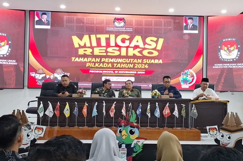Kab-probolinggo.kpu.go.id, Selasa, 19-11-2024, Komisi Pemilihan Umum (KPU) Kabupaten Probolinggo melaksanakan kegiatan Mitigasi Resiko Tahapan Pemungutan Suara Pilkada Tahun 2024 bersama Anggota Panitia Pemilihan Kecamatan (PPK) Se Kabupaten Probolinggo. Saat membuka acara, Ketua KPU Kabupaten Probolinggo, Aliwafa menyampaikan informasi terkait logistik dan Penertiban APK (Alat Peraga Kampanye) “Pada tanggal 23-24 November 2024 akan dilaksanakan secara serentak.” Terangnya. Saat pendistribusian logistik ke Kecamatan hingga ke Desa harap untuk benar-benar dikawal karena logistik menjadi peran utama dalam pemilihan termasuk keamanan dalam penyimpanan. “Jangan sampai ada gudang yang bocor atau kecipratan air sehingga harus dipastikan lagi gudangnya” tambahnya. Menjadi narasumber dalam kegiatan mitigasi, Aiptu Budi Eko Prasetyo, SH menjelaskan bahwa terdapat beberapa yang perlu dilakukan mitigasi mulai dari sebelum pemungutan dan penghitungan, saat pemungutan dan penghitungan serta pasca pemungutan dan penghitungan, ucapnya.