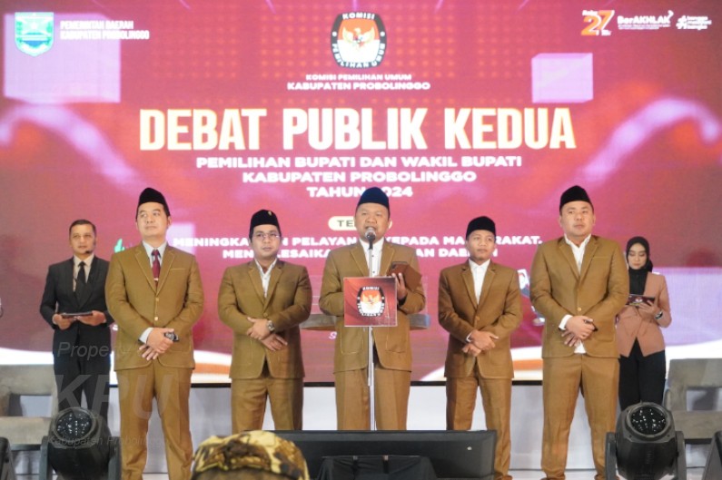 Kab-probolinggo.kpu.go.id, Sabtu, 2-11-2024, Komisi Pemilihan Umum (KPU) Kabupaten Probolinggo menyelenggarakan Debat Publik Kedua Calon Bupati dan Wakil Bupati Probolinggo tahun 2024 di Grand Swiss-Belhotel Darmo, Surabaya dengan tema “Meningkatkan Pelayanan Kepada Masyarakat, Menyelesaikan Persoalan Daerah”. Tampak hadir Pasangan Calon Bupati dan Wakil Bupati Probolinggo serta PJ Bupati Probolinggo, KAPOLRES Probolinggo, Komandan KODIM O820 Probolinggo, BAWASLU Kabupaten Probolinggo dan Dinas/Instansi terkait. Aliwafa selaku ketua KPU Kabupaten Probolinggo saat memberikan sambutan mengajak kepada semua yang hadir untuk sama-sama menghormati dan mematuhi tata tertib yang telah diusung dan dibuat bersama-sama, jelasnya. Ia berharap kepada seluruh masyarakat Kabupaten Probolinggo agar mencerna dengan baik terhadap apa yang disampaikan sehingga bisa menyakinkan untuk datang ke TPS (Tempat Pemungutan Suara) untuk mencoblos, tambahnya.