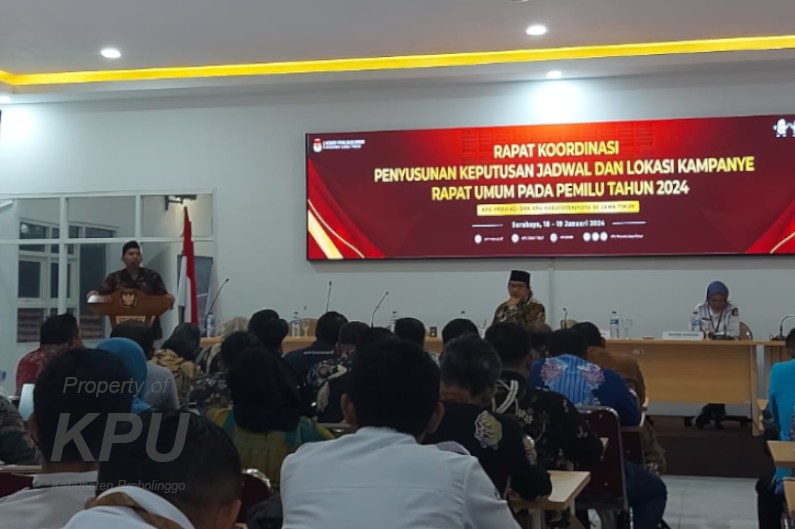 Kab-probolinggo.kpu.go.id, Kamis , 18/1/2024 KPU Provinsi Jatim adakan Rakor Penyusunan Keputusan Jadwal dan Lokasi Kampanye Rapat Umum Pemilu Tahun 2024 selama dua hari di kantor KPU Provinsi Jatim. Rakor ini penting mengingat sesuai tahapan, Kampanye Rapat Umum akan dilaksanakan pada tanggal 21 Januari 2024, dan parpol di tingkat Kabupaten/kota bisa segera mempersiapkan termasuk salah satunya perijinan kepada instansi terkait. Selanjutnya dalam kegiatan Rakor tersebut dilakukan proses perancangan keputusan atau legal drafting yang kemudian akan diterbitkan dalam keputusan KPU Kabupaten/Kota tentang Kampanye Rapat Umum. KPU Kabupaten/Kota dalam penyusunan Keputusan terkait Kampanye Rapat Umum harus berpedoman pada Keputusan KPU Nomor 78 Tahun 2024. Dalam keputusan tersebut diatur zonasi wilayah kampanye Rapat Umum, sehingga kabupaten/Kota tidak boleh membuat zonasi sendiri. Gogot Cahyo Baskoro Divisi Parmas KPU Jatim mengingatkan kepada KPU Kabupaten/ kota untuk segera menerbitkan Keputusan sebelum Kampanye Rapat Umum dimulai " Segera setelah terbit keputusan KPU Kabupaten/kota dapat menyampaikan kepada parpol dan pemangku kepentingan lainnya" ungkap Gogot. Rapat dihadiri oleh Divisi Parmas dan Divisi Hukum serta Kasubbag Tekmas atau admin/operator Sikadeka Se Jatim. KPU Probolinggo hadir Divisi Parmas dan SDM Aliwafa dan Kasubbag Tekmas Domenicus Widji Nugroho .