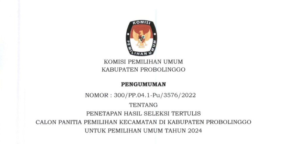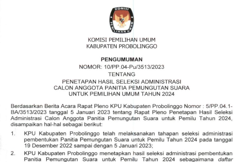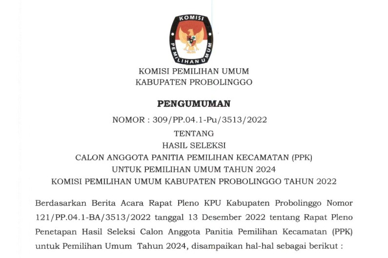 Probolinggo - Berdasarkan Berita Acara Rapat Pleno KPU Kabupaten Probolinggo nomor: 121/PP.04-BA/3513/2022 tanggal 13 Desember 2022 tentang Rapat Pleno Penetapan Hasil Seleksi Calon Anggota Panitia Pamilihan Kecamatan untuk Pemilu 2024, disampaikan sebagai berikut :