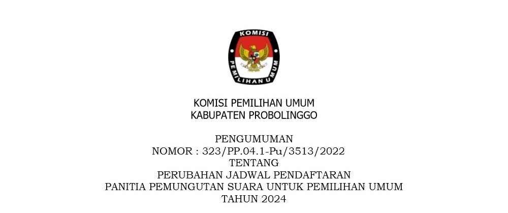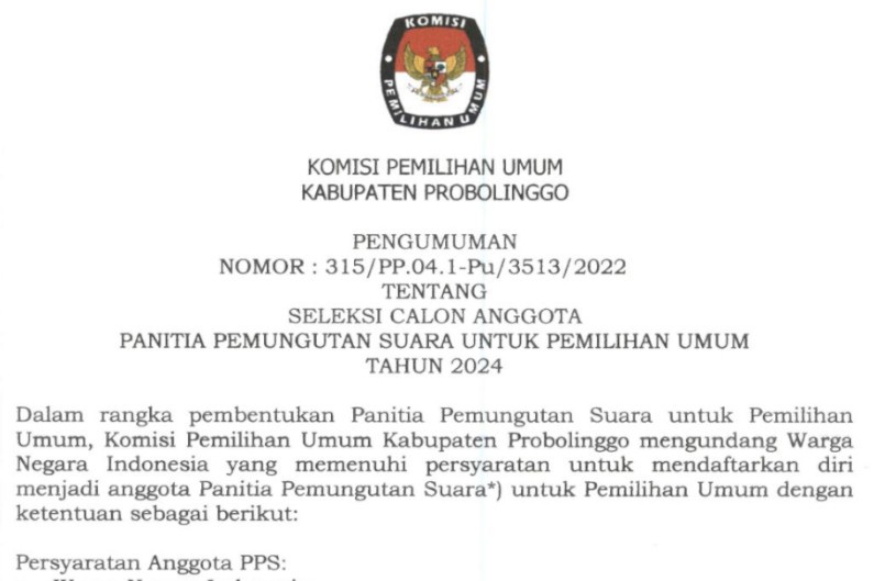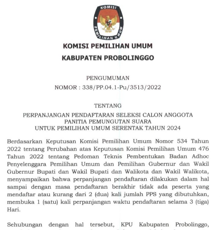 KPU Kabupaten Probolinggo Mengumumkan Secara Resmi Nomor : 309/PP.04.1-PU/3513/2022 Tentang Hasil Seleksi Calon Anggota Panitia Pemilihan Kecamatan Untuk Pemilihan Umum Tahun 2024 dapat diunduh pada tautan berikut : PENGUMUMAN HASIL AKHIR SELEKSI PANITIA PEMILIHAN KECAMATAN (PPK)