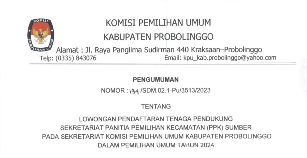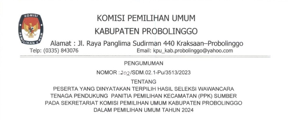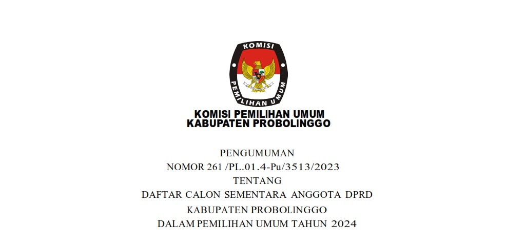 kab-probolinggo.kpu.go.id, Sabtu 19-8-2023 Bahwa untuk melaksanakan ketentuan Pasal 70 Peraturan KPU Nomor 10 Tahun 2023 tentang Pencalonan Anggota Dewan Perwakilan Rakyat, Dewan Perwakilan Rakyat Daerah Provinsi, dan Dewan Perwakilan Rakyat Daerah Kabupaten/Kota, KPU Kabupaten Probolinggo mengumumkan Daftar Calon Sementara (DCS) Anggota DPRD Kabupaten Probolinggo dan persentase keterwakilan perempuan dalam Daftar Calon Sementara (DCS).